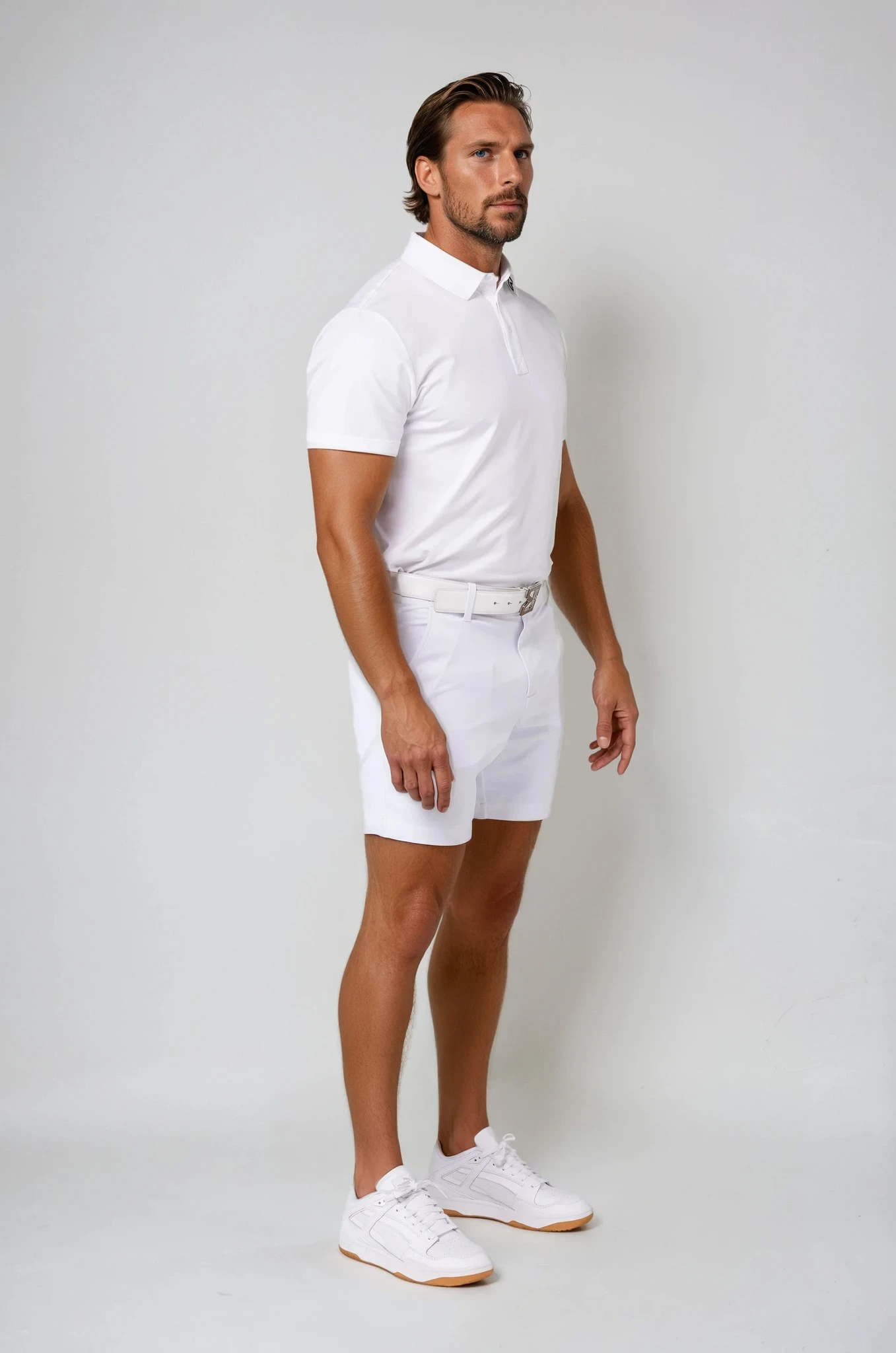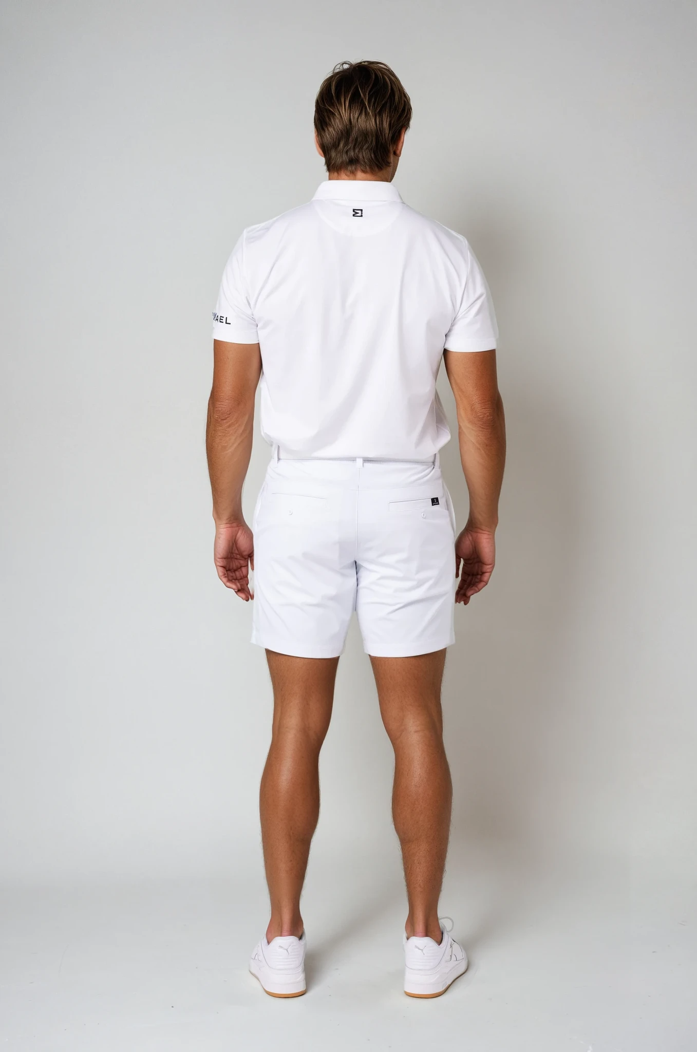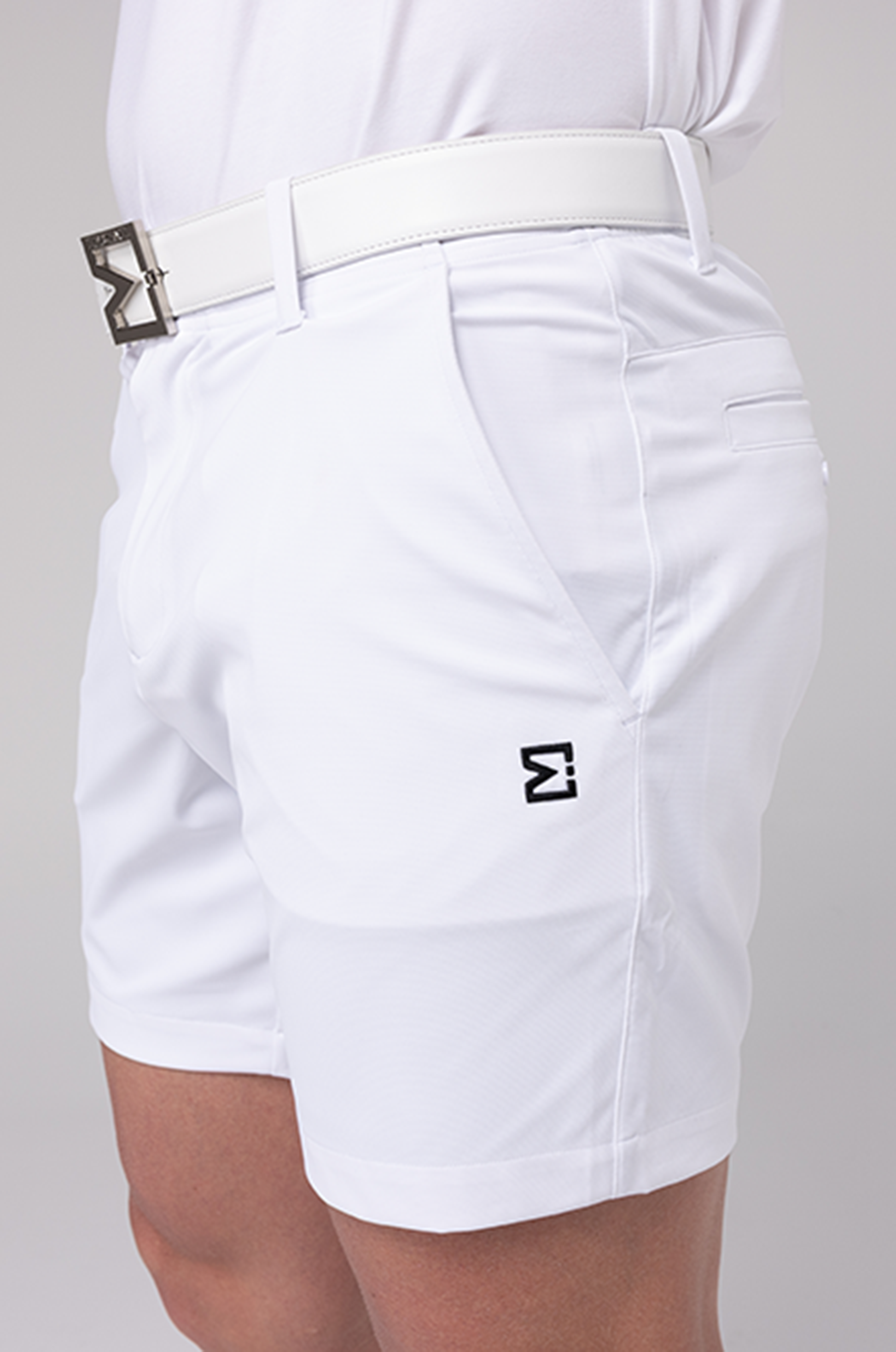 Crafted from E. Michael’s reinforced lightweight polyester–elastane blend, the fabric offers breathable stretch and resilient recovery, maintaining shape and ease throughout the day. In Summit White, the tone is crisp and timeless — a refined essential within the E. Michael performance wardrobe.