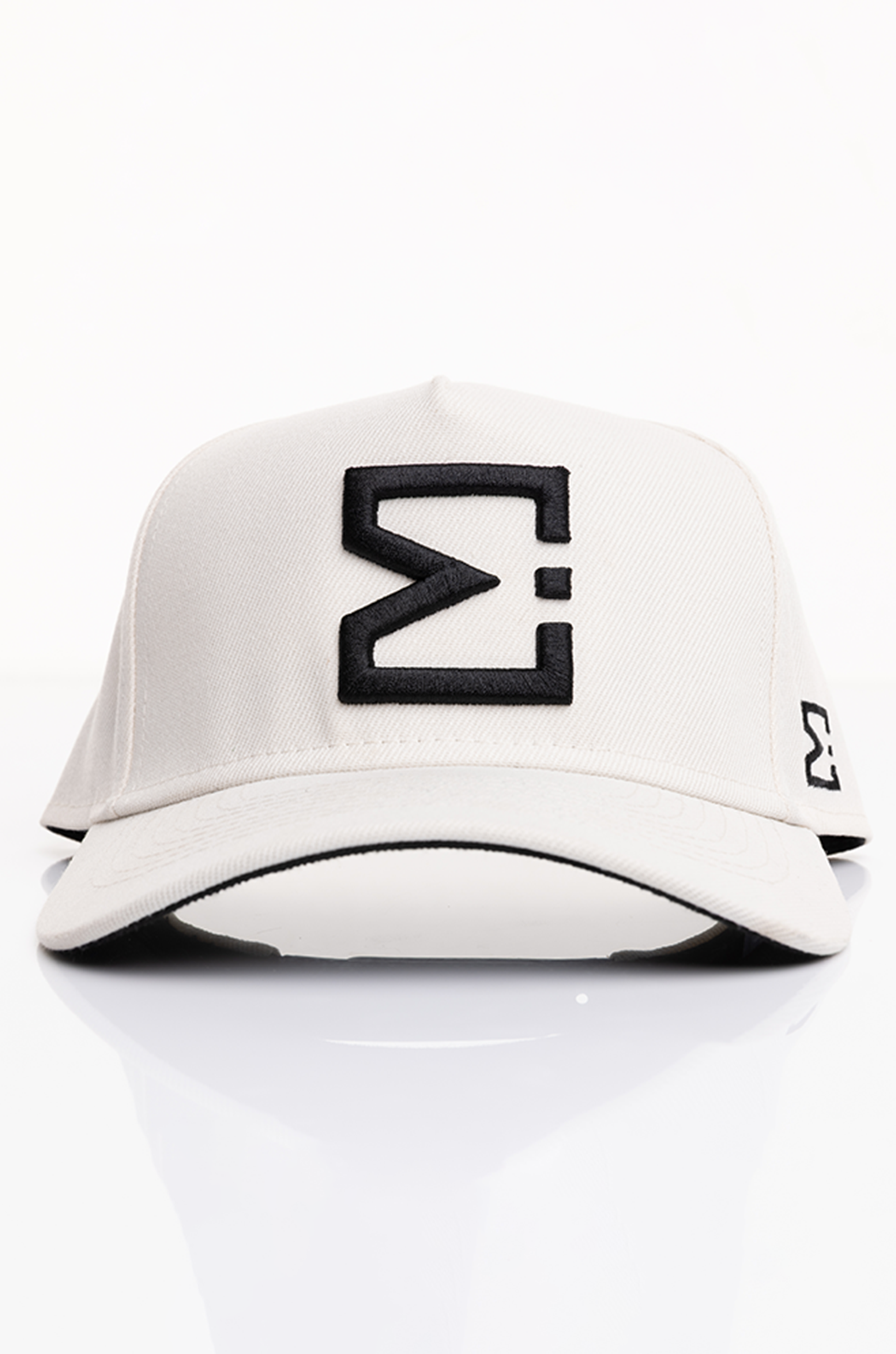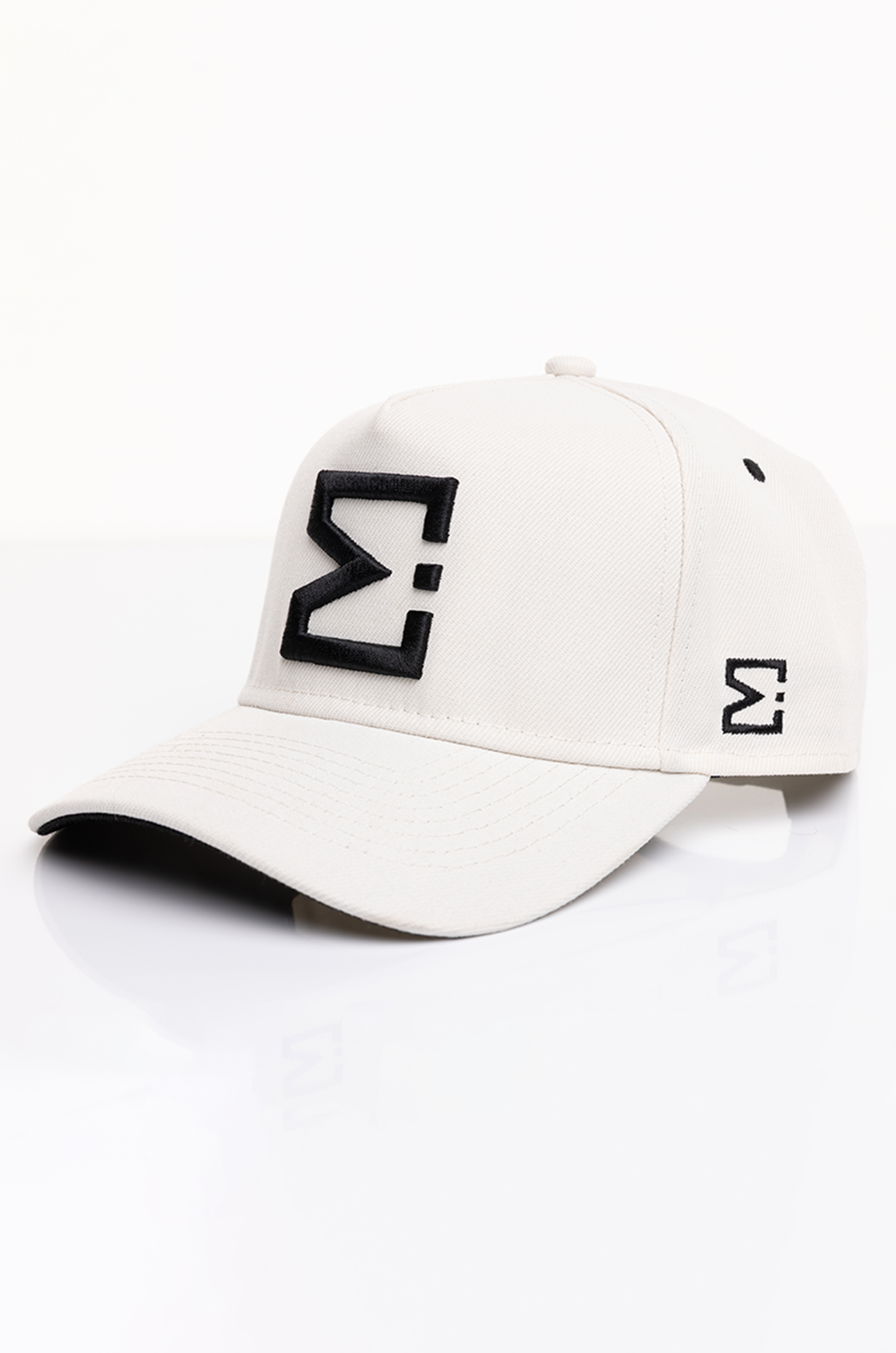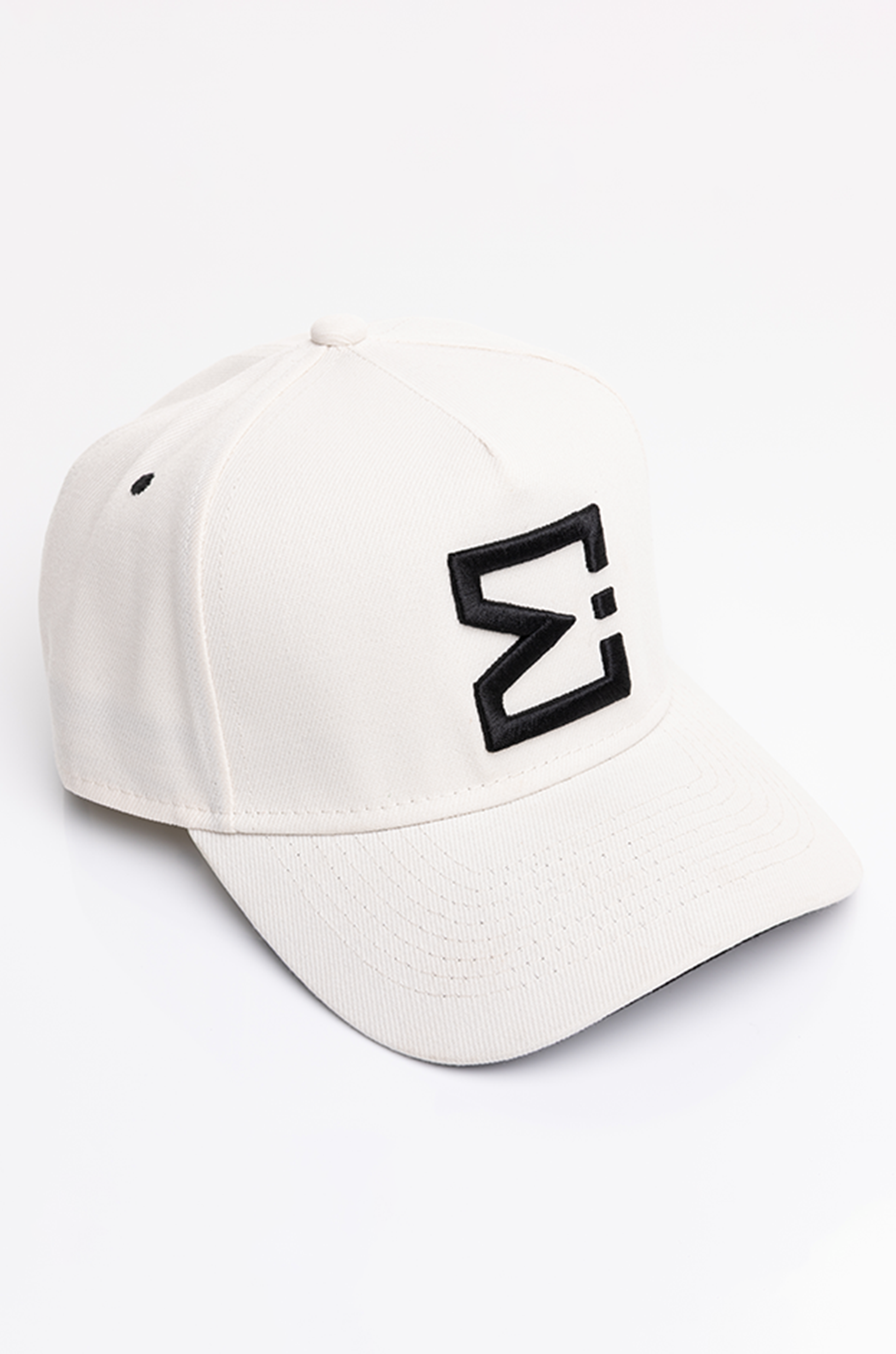 A monochromatic Sandstone foundation is contrasted with precise black embroidery, a deliberate study in balance and proportion within the E. Michael colour system. The five-panel structure maintains a composed silhouette, engineered to hold its shape through wear without excess weight.